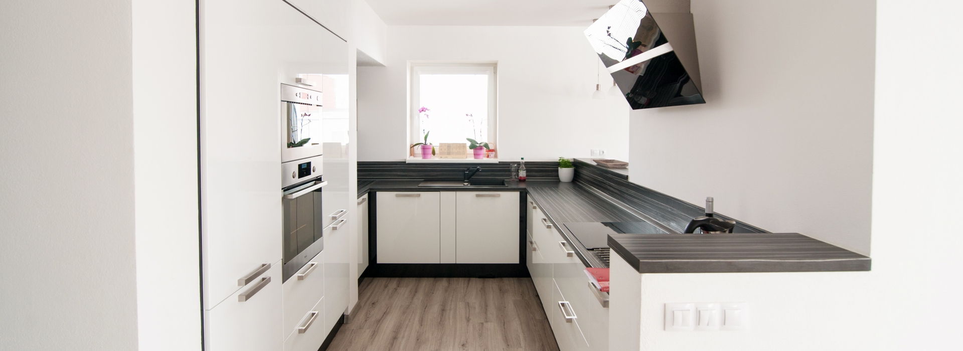 Bílá lesklá kuchyně lemovaná černým leskem a pracovní plocha z desky Black esprit Wodego je velmi výraznou kombinací, kterou podtrhují prosklená dvířka v nerezovém rámečku.